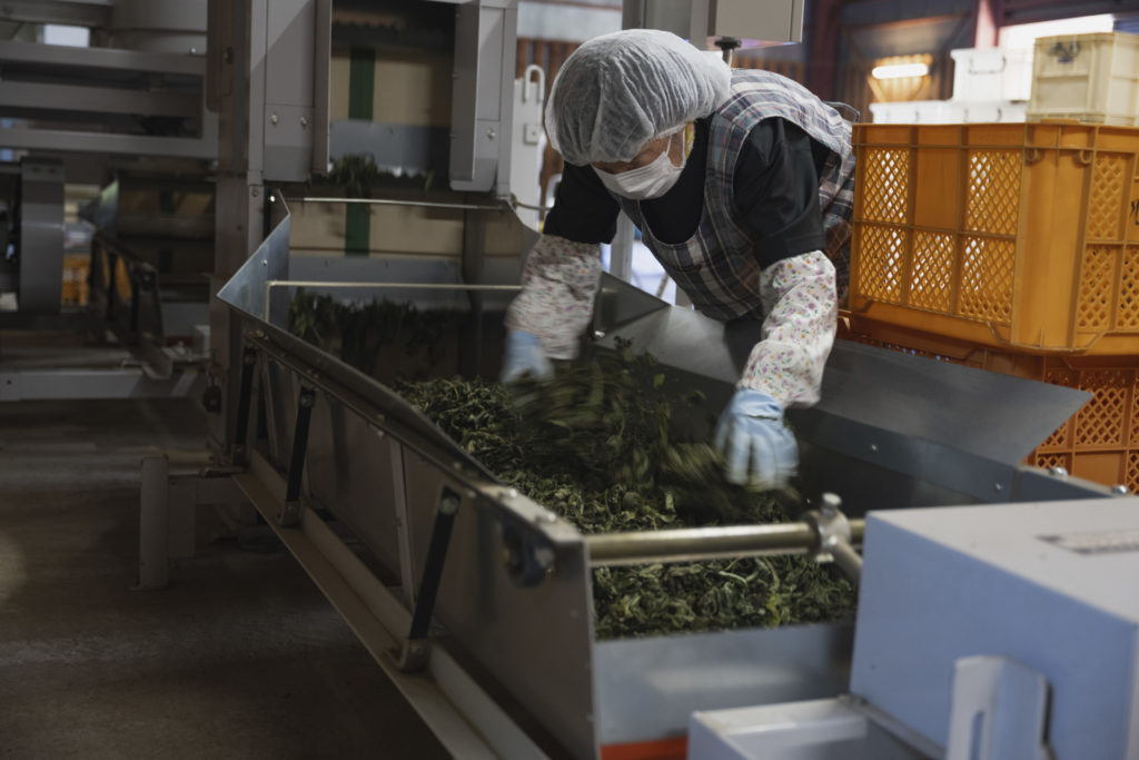 収穫された大切な茶葉は、福祉事業所利用者の方に依頼してもぎ取り作業を行い、工場にやってくる。
