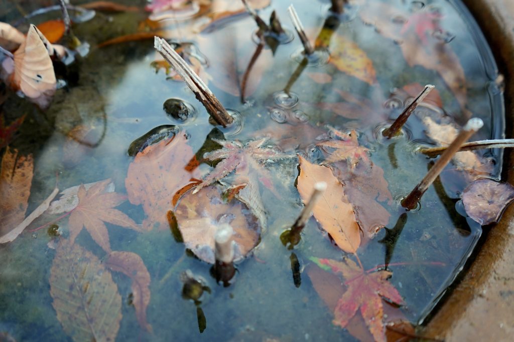 山茶花やチャノキの花が咲く一方、優美だった紅葉ははらり、はらりとこぼれ落ち睡蓮鉢の中で朽ちた姿さえ美しい。